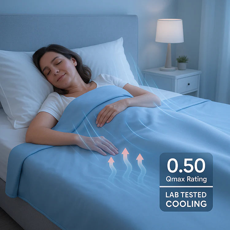 Qmax measures how cool fabric feels on your skin. Our 0.50 rating is the highest possible. Higher Qmax = more cooling power.