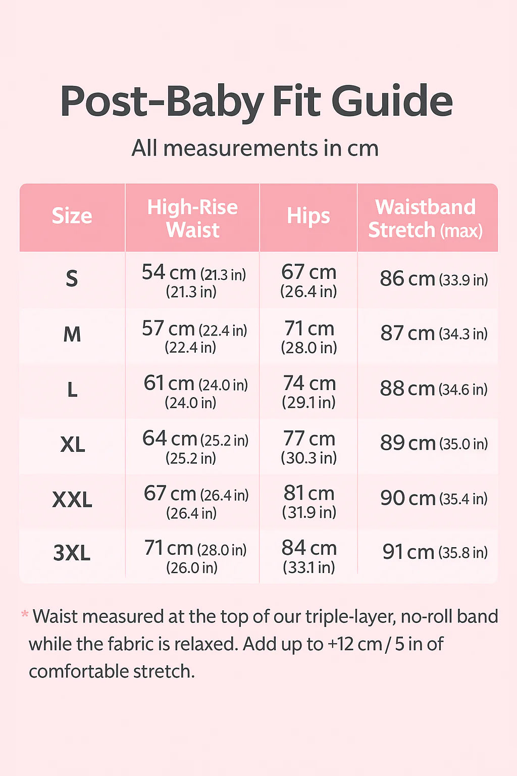 Fit tip: In the first 6–8 weeks postpartum, if you’re between sizes, choose the larger size for comfort. 30-Day Try-On—easy exchanges.