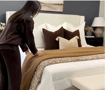 Stays fresh up to 3x longer, with up to 3x less laundry needed. This innovative self-cleaning feature stems from the silver-infused fabric's ability to combat bacterial growth, ensuring that the comforter remains hygienic for extended periods. Traditional comforters often require frequent washes due to the accumulation of sweat, skin cells, and other contaminants — even if you use a duvet cover or sham. The silver component in our products naturally repels these pollutants, significantly reducing the frequency of washes. This saves time and effort and contributes to a sustainable lifestyle by conserving water and energy. Check out our Care Guide for easy instructions on how to keep your Miracle Made® Cooling Comforter looking and feeling its best.